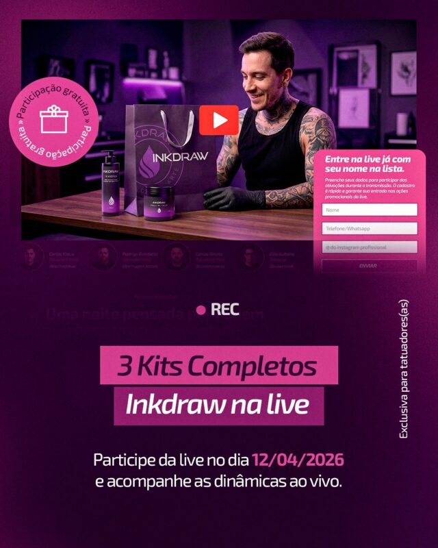 A Inkdraw preparou uma live para reunir tatuadores que respiram evolução, presença de mercado e vontade de crescer no estúdio. Além da transmissão, o público cadastrado participa de ações especiais com sorteios e campanhas paralelas durante o evento.